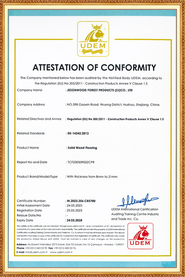 في Jesonwood ، تم تصميم كل قطعة من الأرضيات الصلبة الصلبة بمسؤولية. يتوافق مصادرنا مع المعايير الدولية ، بما في ذلك شهادات FSC و PEFC و JAS و CE. نلتزم أيضًا بقانون Lacey و Eudr لضمان الحصول على جميع المواد الخام بشكل قانوني. إن التزامنا بالمسؤولية البيئية يعني أنه يمكنك الاستمتاع بأرضياتك بثقة وراحة ذهنية.