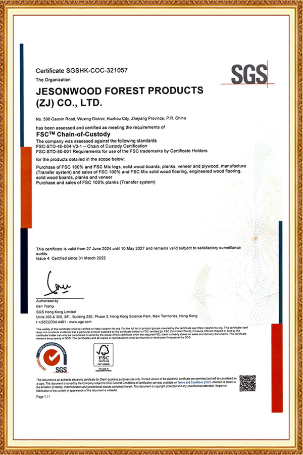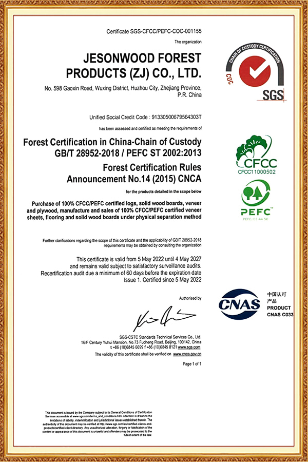 نحن نأخذ الاستدامة والامتثال القانوني على محمل الجد. يضمن إدارة الشرعية المادية لدينا أن يتم الحصول على جميع المواد الخام بمسؤولية ووفقًا للوائح الدولية مثل قانون لاسي وتنظيم إزالة الغابات في الاتحاد الأوروبي (EUDR). تم اعتماد Jesonwood بالمعايير العالمية بما في ذلك FSC و PEFC و CE و ISO و JAS و UKCA.